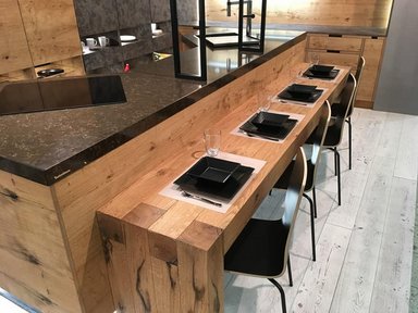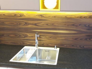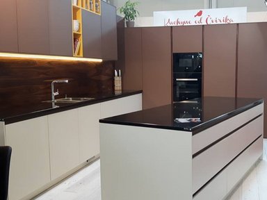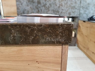 Materiál TechniStone NOBLE ATHOS BROWN, rezanie CNC píla, materiál spracovaný na hrúbku 60mm pomocou rezania pod 45° a lepenia, spoj je v hranke a je neviditeľný, výrez CNC pre drez s montážou pod pracovnú dosku, varná platňa zapustená do roviny s pracovnou doskou.