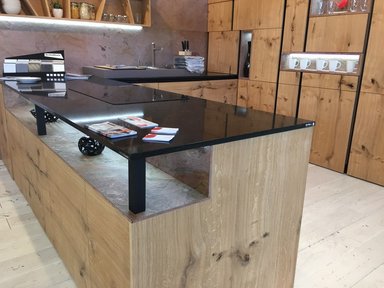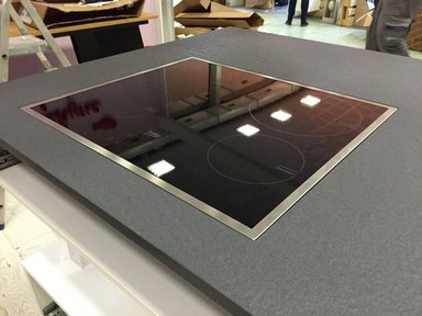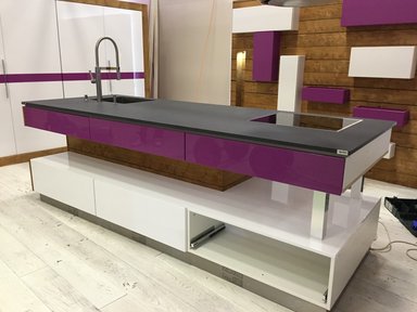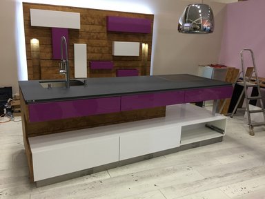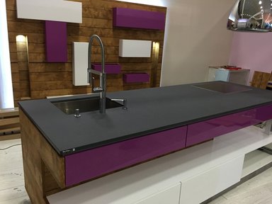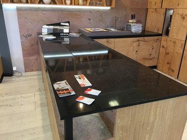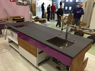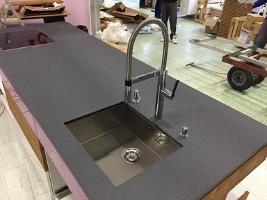 Materiál TechniStone NOBLE SILVER NOTE, rezanie CNC píla, spracovanie hrán profilovanie leštiaci automat, výrez pre drez s montážou na pracovnú dosku, varná platňa osadená na pracovnú dosku.
